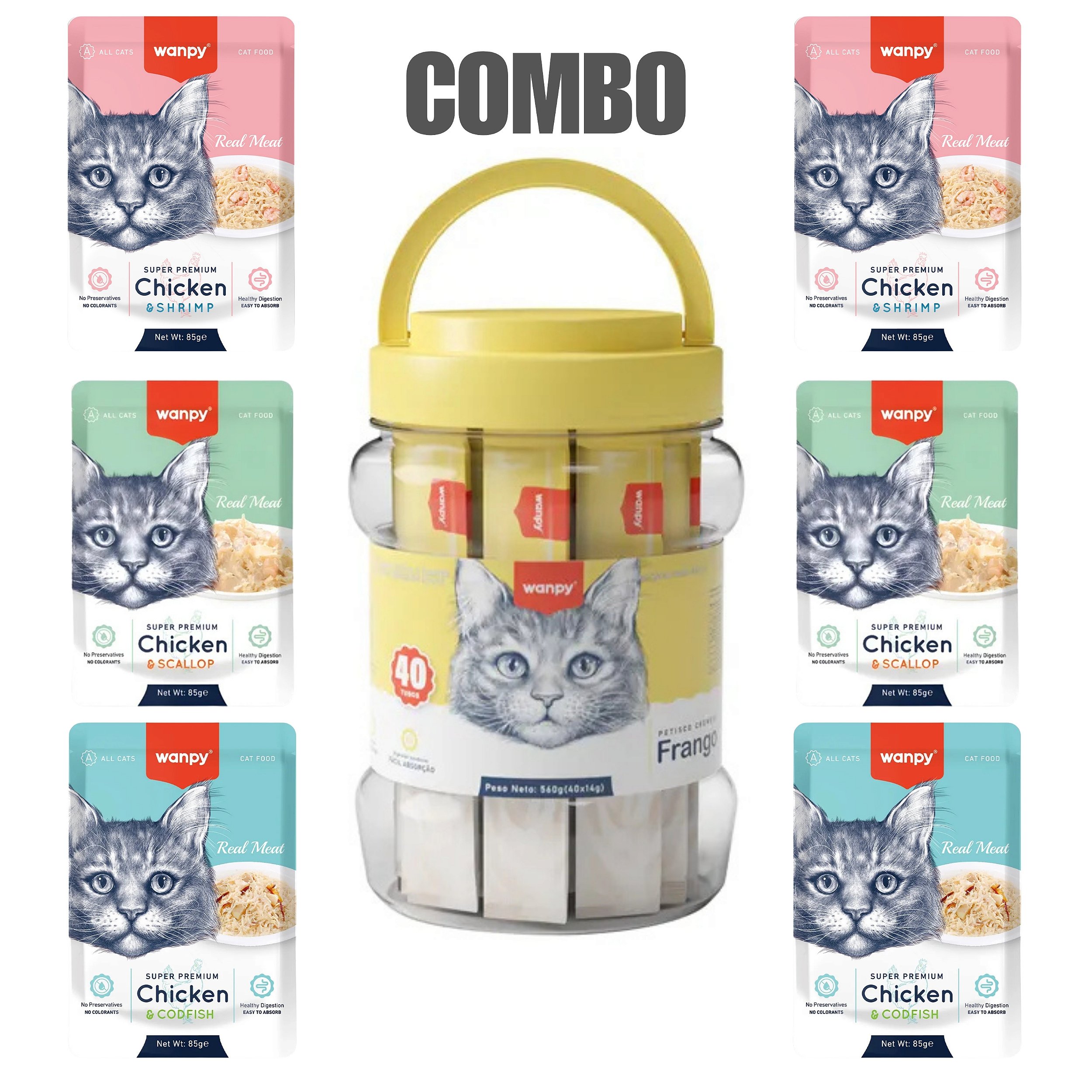 O Combo Wanpy foi pensado para tutores exigentes e gatos de paladar refinado, reunindo variedade, qualidade super premium e muito sabor em um só kit.